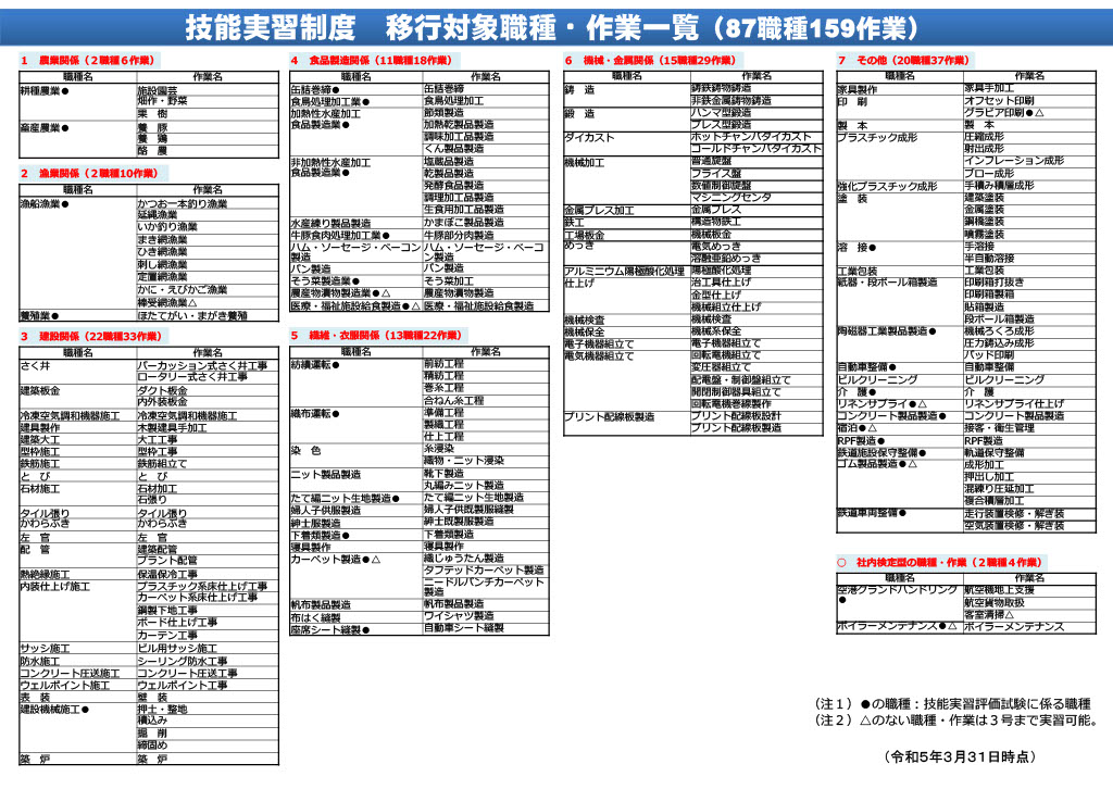 技能実習制度(職種・作業一覧)